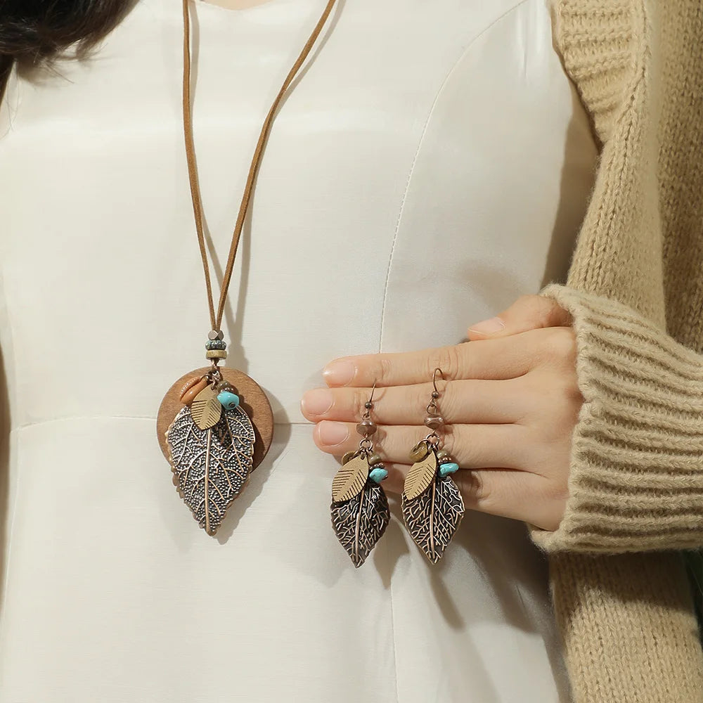 Boho Leaf Charm Jewelry Set – Nature-Inspired Necklace & Earrings